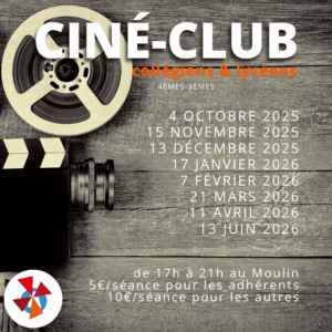 Un samedi par mois, les collégiens et lycéens se retrouvent au moulin autour d’un film de 17h à 20h45. A la fin de chaque film le groupe discute du film et en débat autour de pizza qu’ils partagent tous ensemble. Ainsi le ciné-club permet aux jeunes de développer leur esprit critique grâce à des débats animés et traitant des sujets divers et variés.